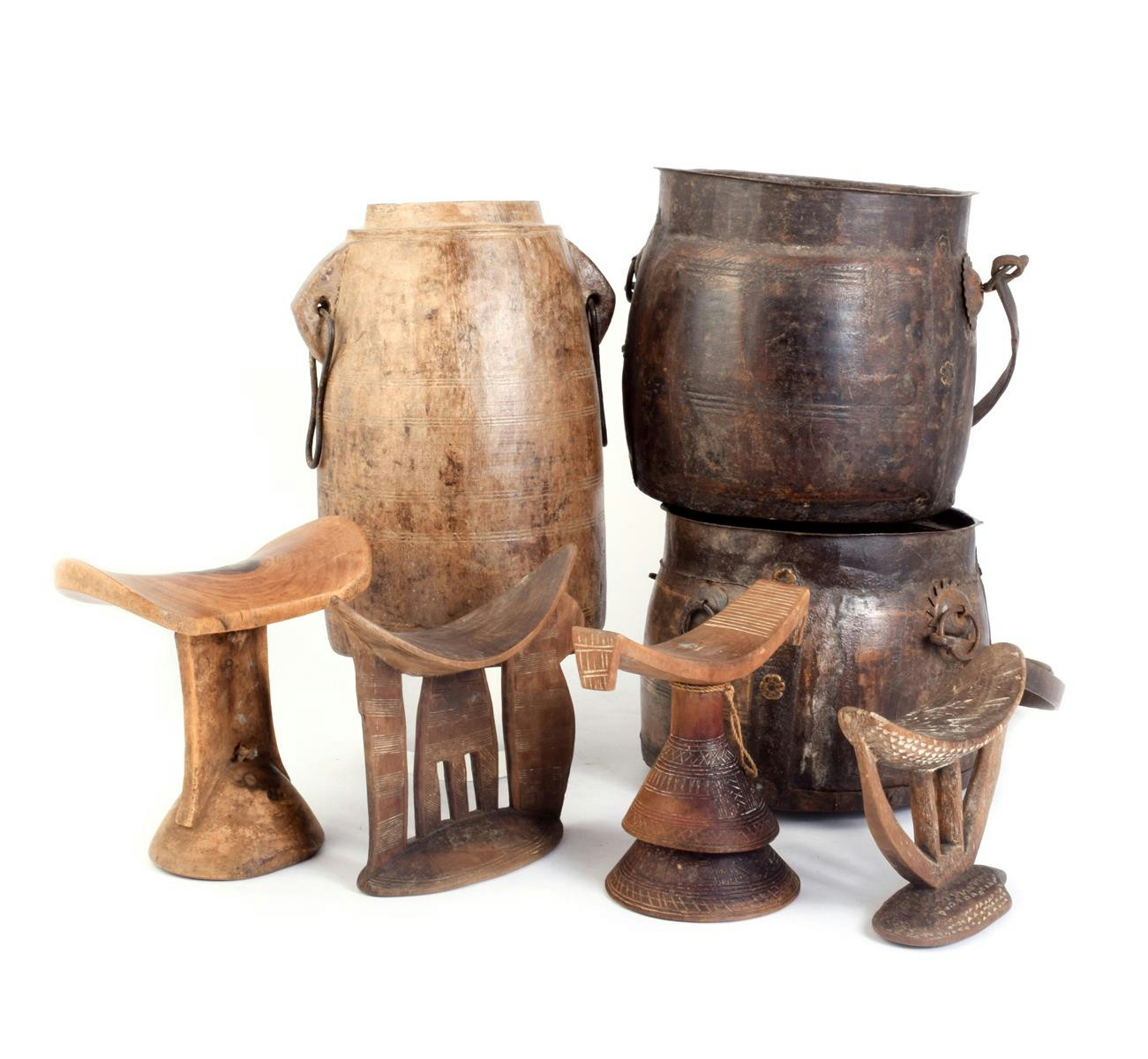 Four East African headrests, and three wood containers with iron handles, the highest 32cm high. (7)