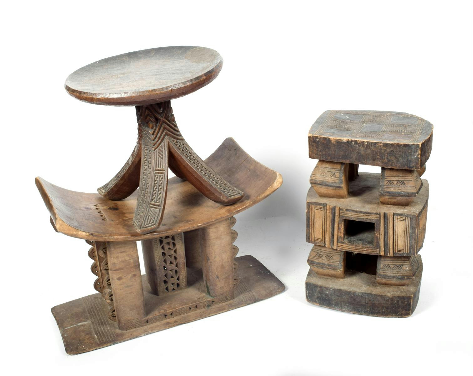 An Ashanti stool, with pierced central column support, 34.5cm, a Nigerian square stool with incised decoration, 43cm, and an Igbo circular stool. (3)