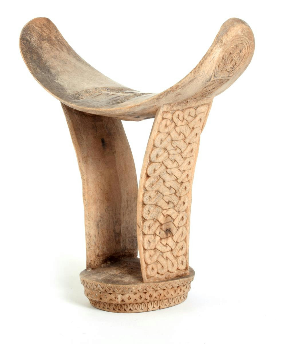 A Boni headrest, with carved geometric decoration, the top with later incised initials, 17.1cm high.