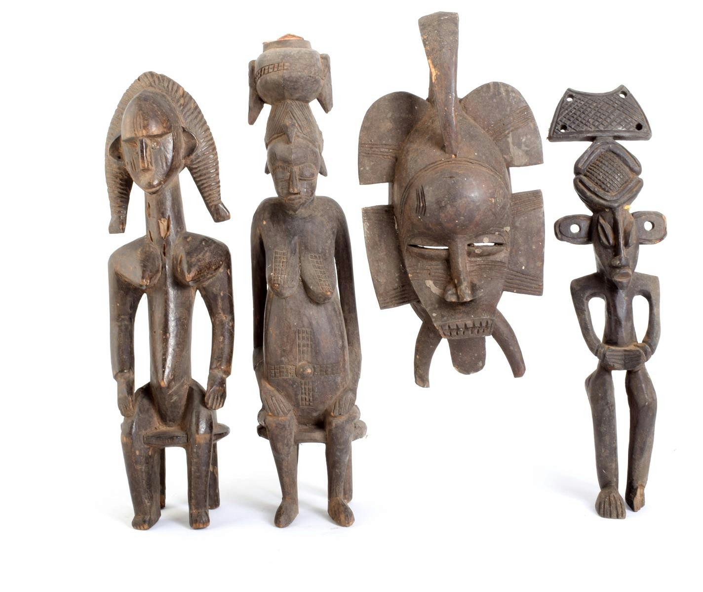 A Senufo seated female figure, 49.5cm high, a Bambara seated female figure, 46.8cm high, a Senufo mask, 37cm high and a standing figure, 44cm high. (4)