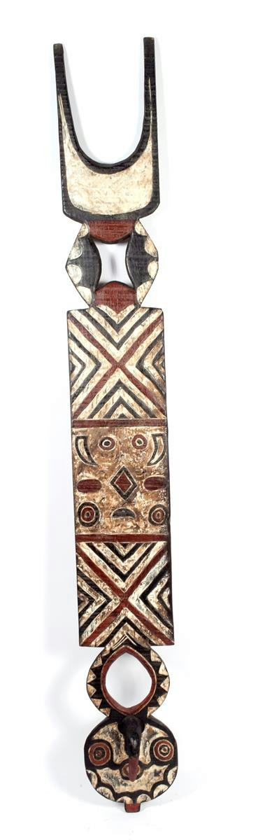 A Mossi plank mask, with geometric decoration, with black, red and white pigment, 200cm high.