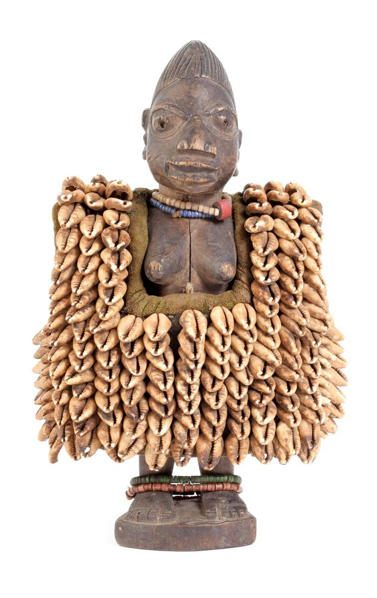 A Yoruba standing female Ibeji figure, the back of coiffure pierced, with cowrie shell jacket and beads, 25.6cm high.