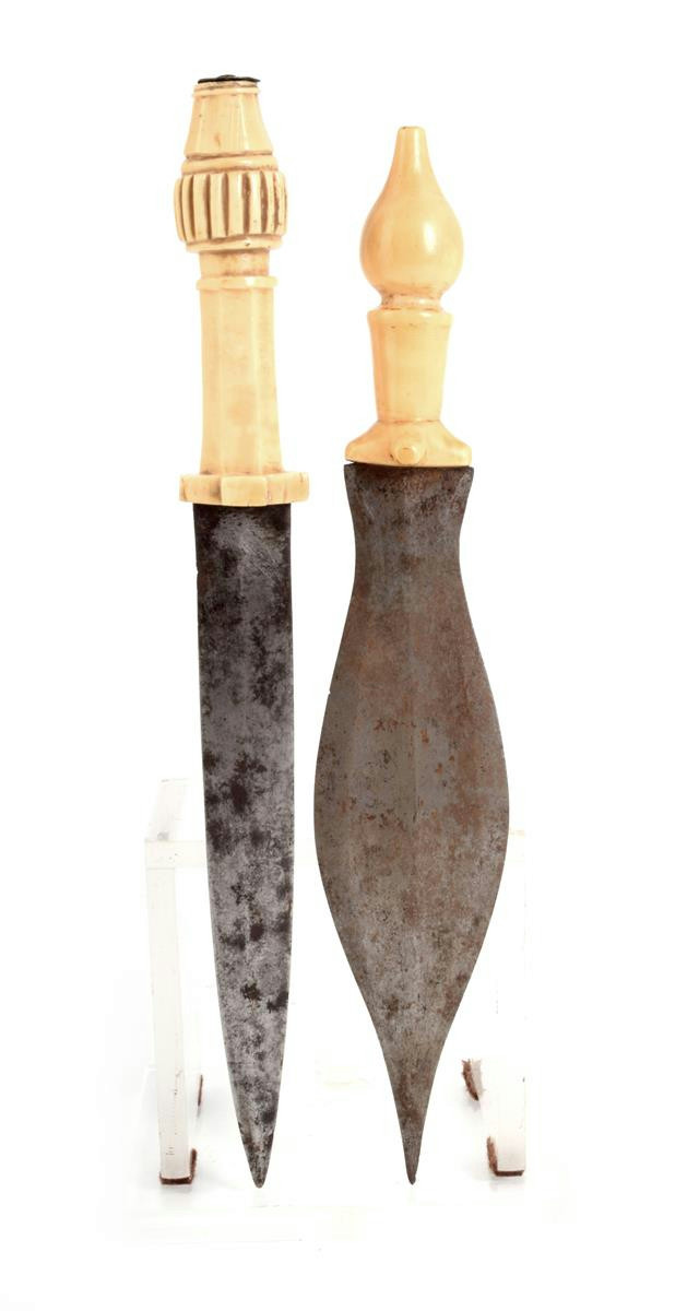 λ An African knife, with a leaf shape blade and ivory handle, 30cm long and an African knife with faceted and ribbed ivory handle, with leather scabbard, 32.5cm long. (2)