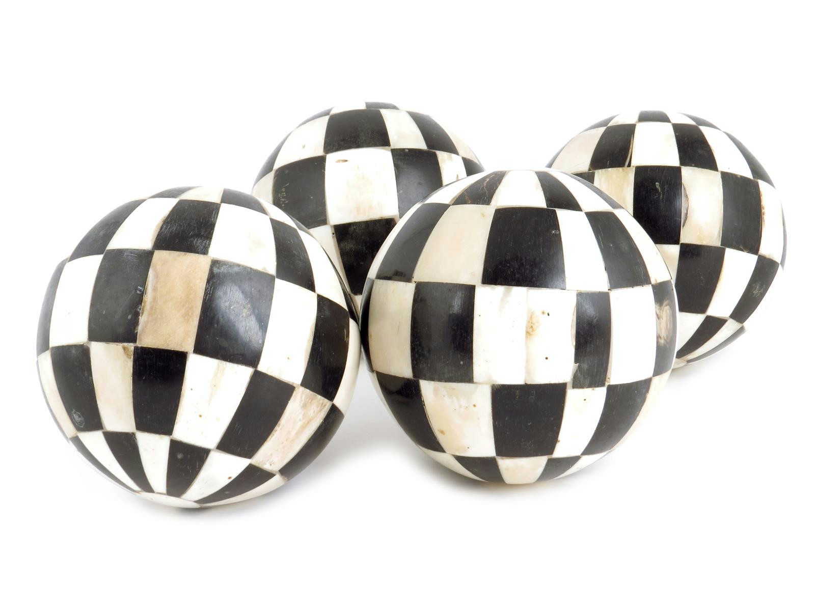 A set of four horn and bone carpet bowls, with alternate segmented veneers, 11.5cm diameter. (4)