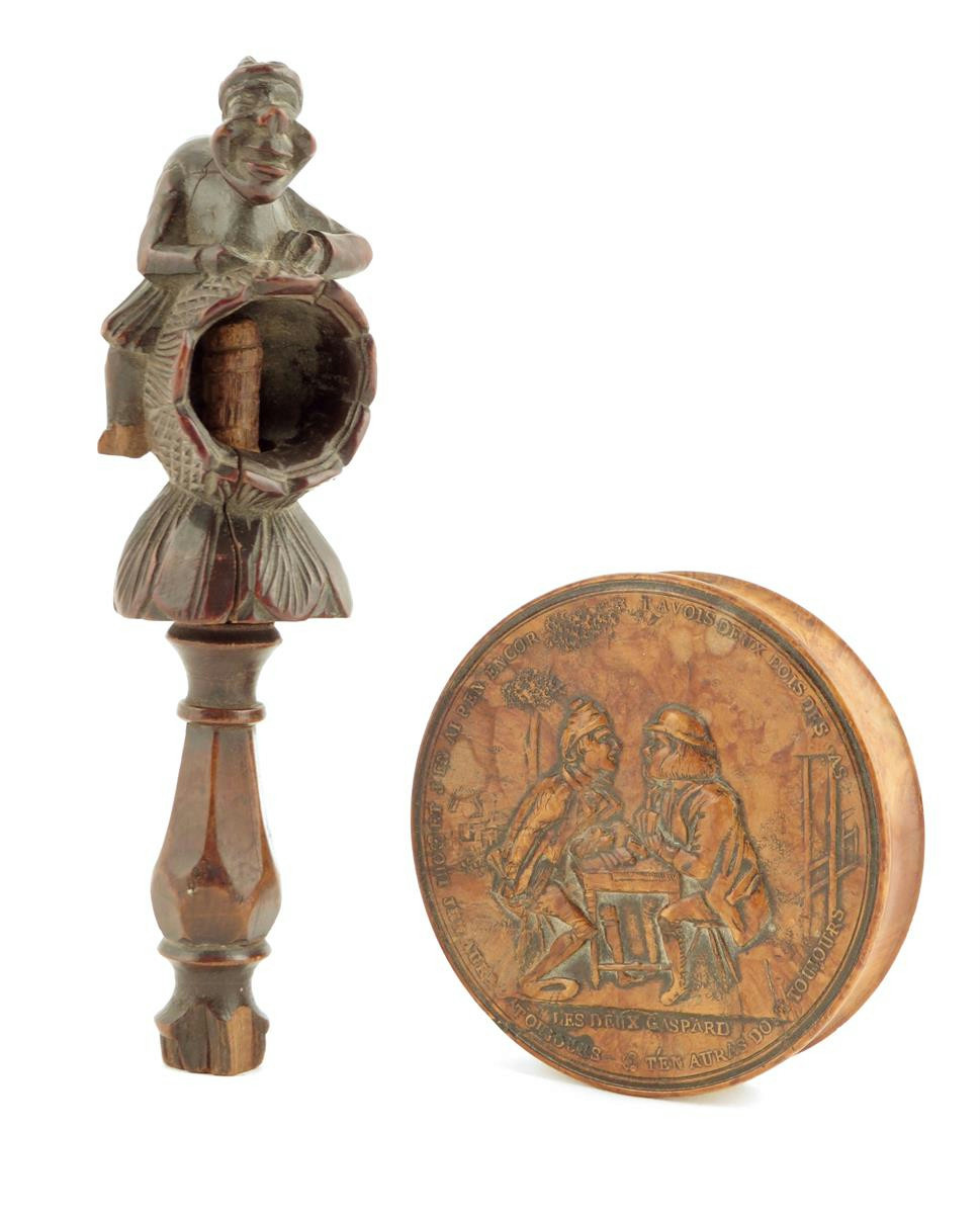 An early 19th century French pressed burr maple snuff box, the lid with a scene of two men playing cards titled 'LES DEUX GASPARD', the rim with an inscription to a tortoiseshell lined interior, the base originally with a portrait miniature, 8cm diameter, together with a Swiss treen screw nutcracker, modelled with a hunchback straddling a flower, 5.8cm long.
