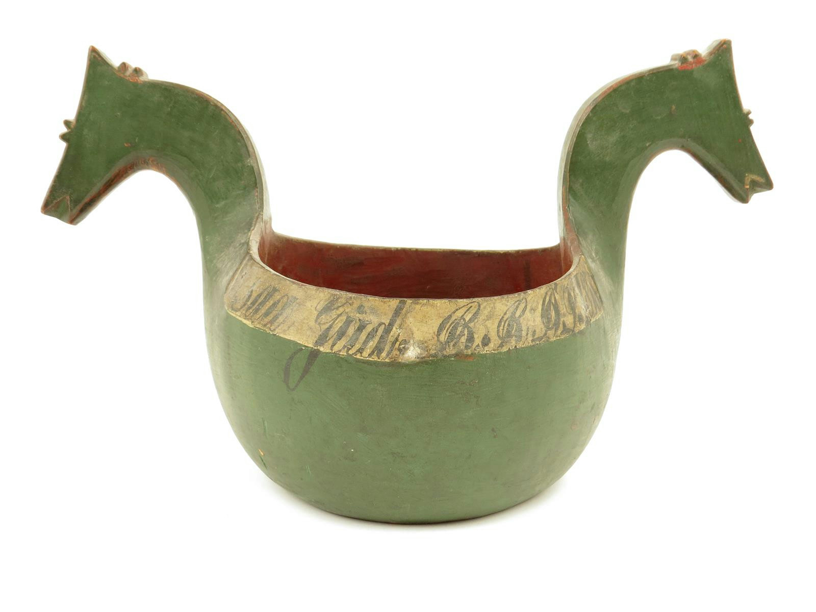A 19th century Norwegian painted and carved wood kasa, with horse's head handles to an inscribed rim and dated '1858', 19.3cm high, 33.3cm wide.