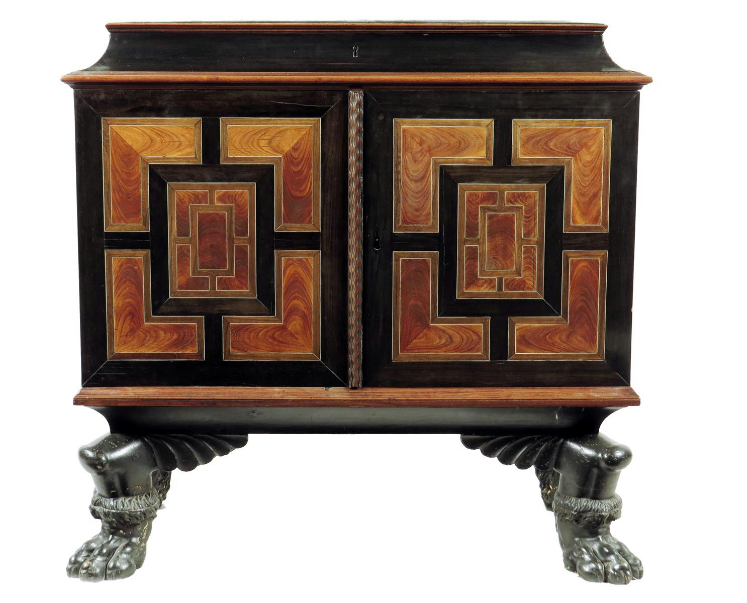 λ A late 17th century Flemish ebony and kingwood cabinet, inlaid ivory stringing, with geometric panelled decoration, the hinged top revealing a vacant compartment above a pair of doors with a ripple moulding enclosing an arrangement of nine drawers, three with veneered linings, all fitted with later brass ring handles, originally with side carrying handles, on an associated and later ebonised stand with winged paw feet, 94.8cm high, 103cm wide, 47.7cm deep.