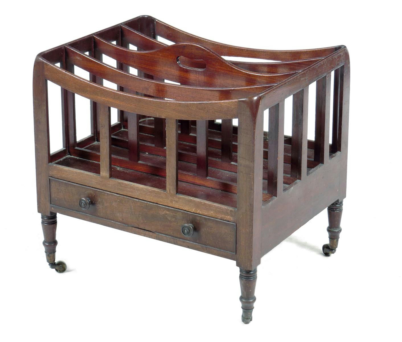 A Regency mahogany Canterbury, with four dipped divisions and a central pierced handgrip above a frieze drawer on brass castors, 50.3cm high, 50.5cm wide, 40cm deep.