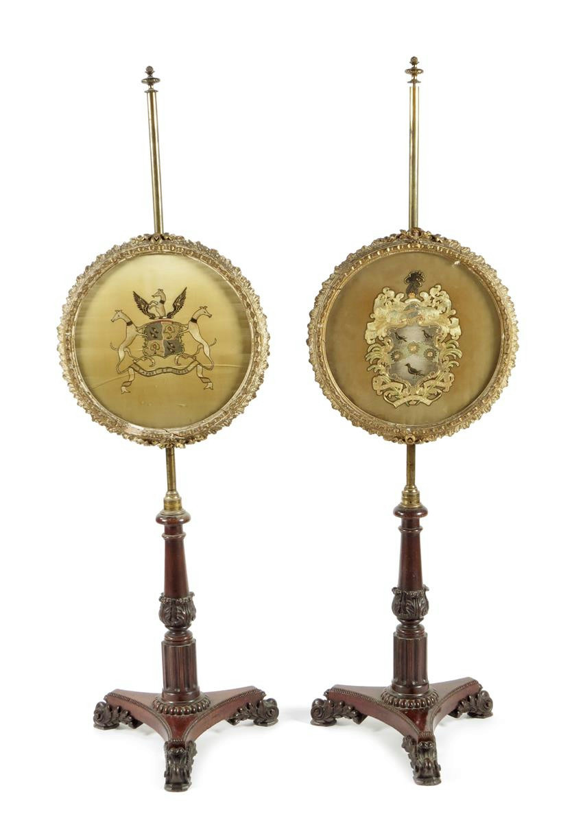 A pair of George IV mahogany pole fire-screens in the manner of Gillows