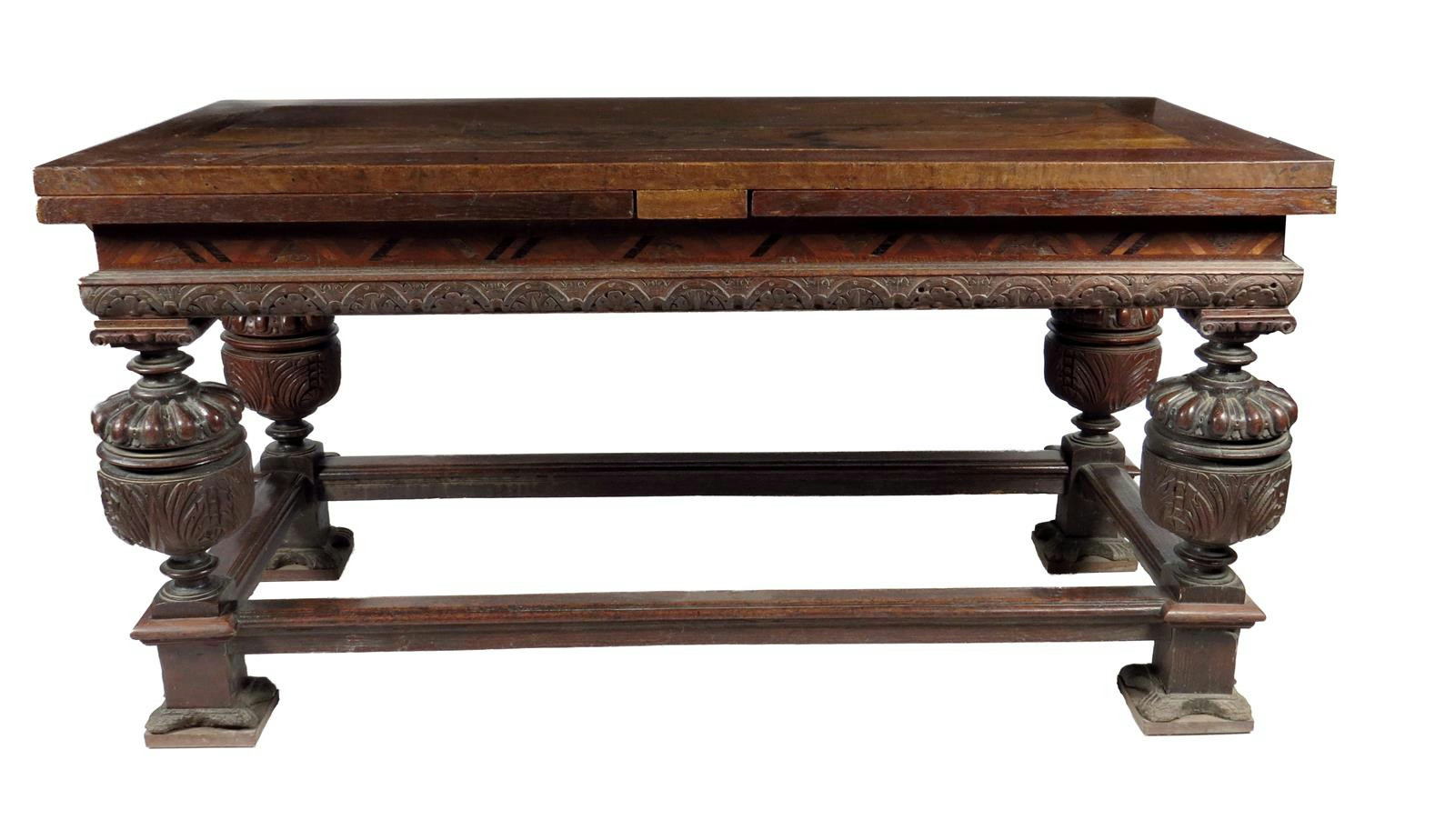 An early 17th century and later joined oak withdrawing table, the rectangular panelled top above an inlaid parquetry chevron frieze to a lunette moulding on Ionic capitals and lobed and leaf carved baluster legs united by peripheral stretchers, 89cm high, 173.7cm wide, 89.5cm deep.