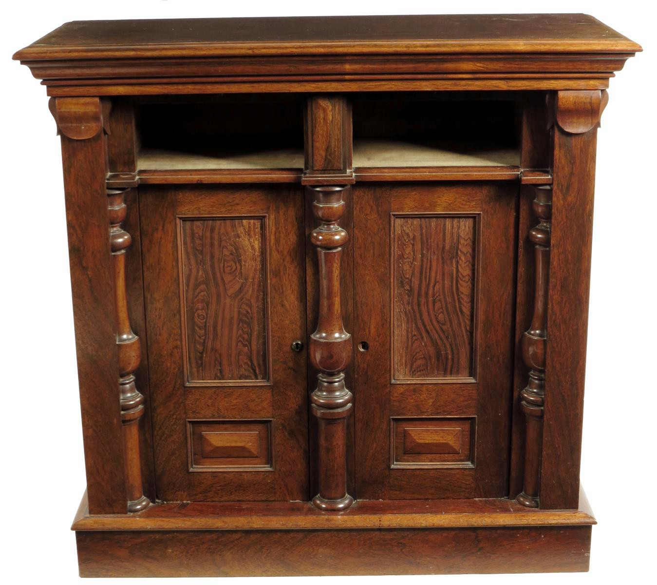 λ An early Victorian rosewood side cabinet, with a pair of velvet lined apertures above a pair of cupboard doors with simulated panels enclosing adjustable shelves flanked by split baluster pilasters, 94.8cm high, 98.7cm wide, 39.8cm deep.