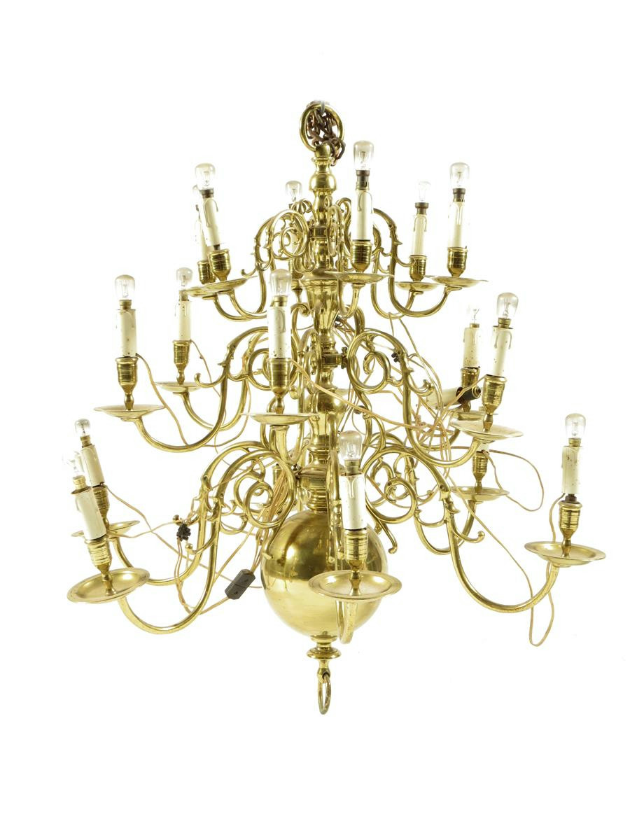 A Dutch brass three tier eighteen light chandelier, with scroll arms and a vase turned stem to a ball base, 89cm high, 86cm wide.