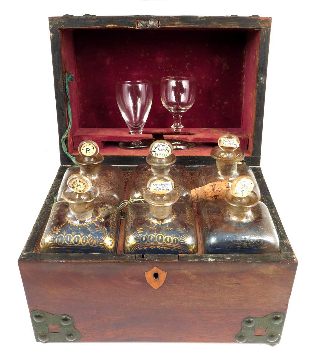 A 19th century mahogany and brass mounted decanter box, the interior with a plush lined lid holding two associated glasses above six paper-lined divisions containing six gilt decorated glass decanters and stoppers, 21cm high, 26cm wide, 18.5cm deep.