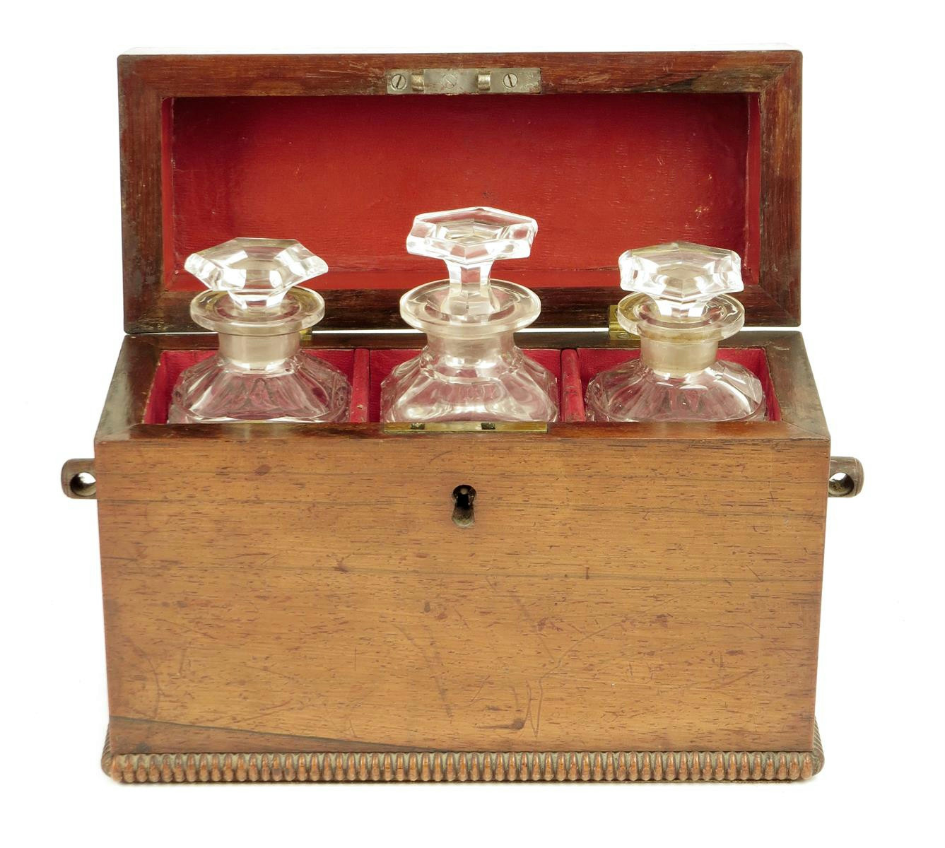 λ A William IV rosewood decanter box, with nulled mouldings, the leather lined divided interior with three glass decanters and stoppers, one later, previously with ring handles, 21.3cm high, 32.3cm wide, 12.5cm deep.