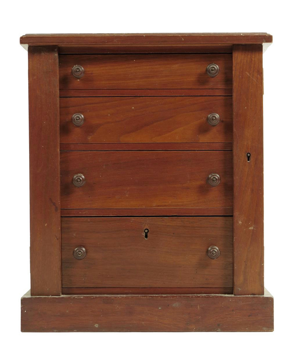 A Victorian walnut miniature Wellington chest, with four plush lined drawers and a locking pilaster, 42cm high, 35.5cm wide, 23.7cm deep.