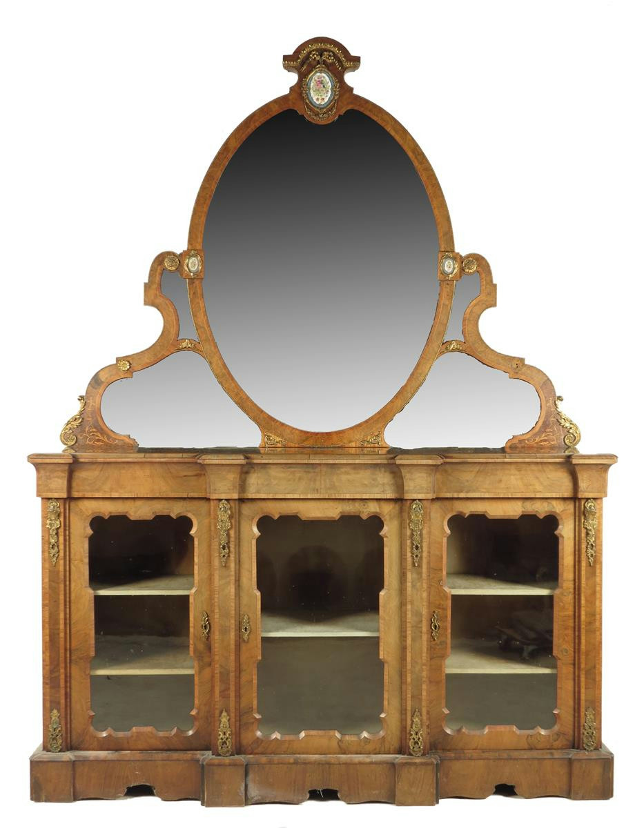 A Victorian walnut breakfront credenza, the associated mirrored back with Sevres style porcelain plaques and gilt metal mounts above three doors enclosing shelves, 248.7cm high,182.8cm wide, 45.5cm deep.