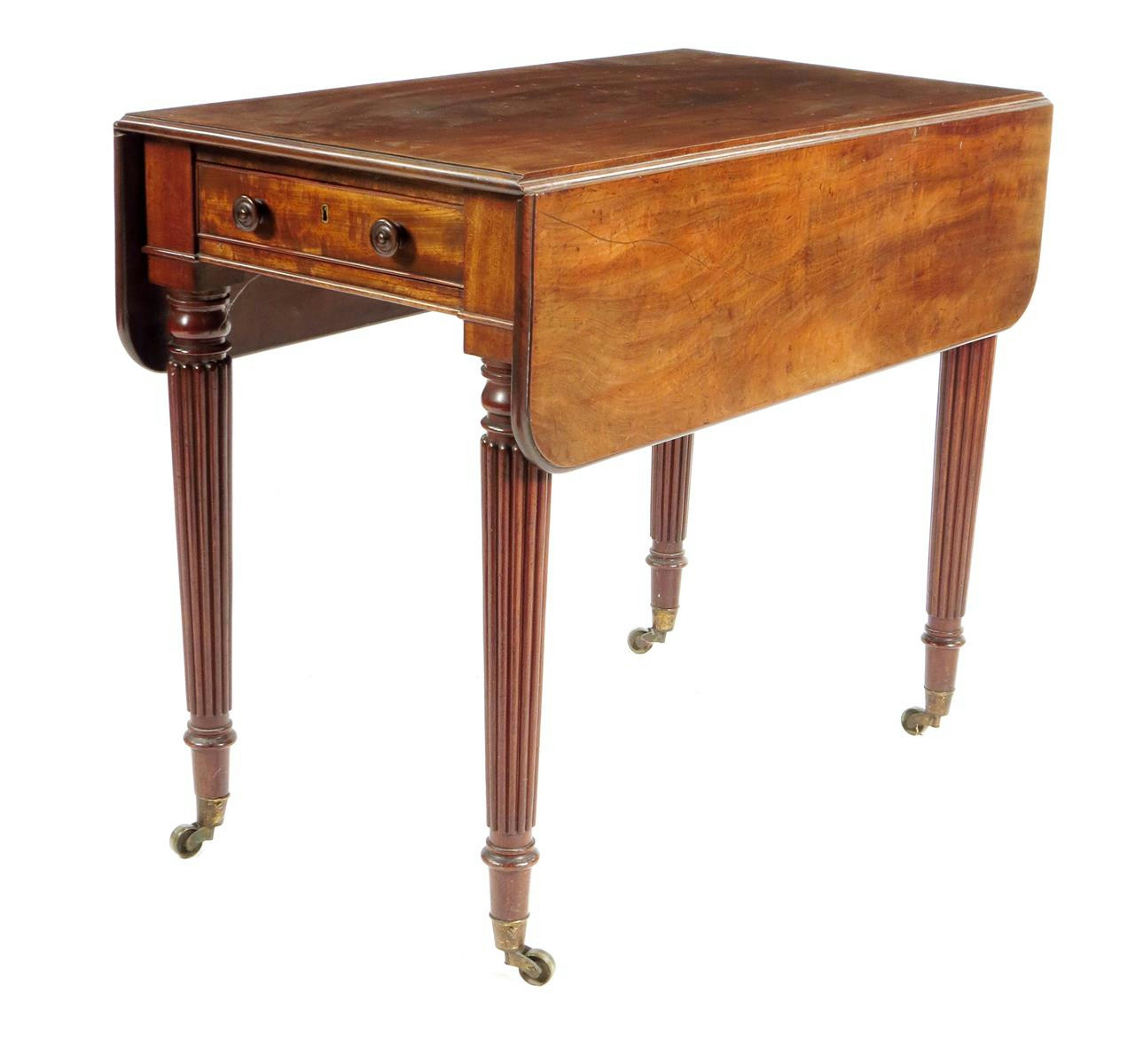 A William IV mahogany Pembroke table in the manner of Gillows, with a frieze drawer and a faux front to the reverse on ribbed tapering legs and brass caps and castors, 72.2cm high, 49cm wide (closed), 85cm deep.