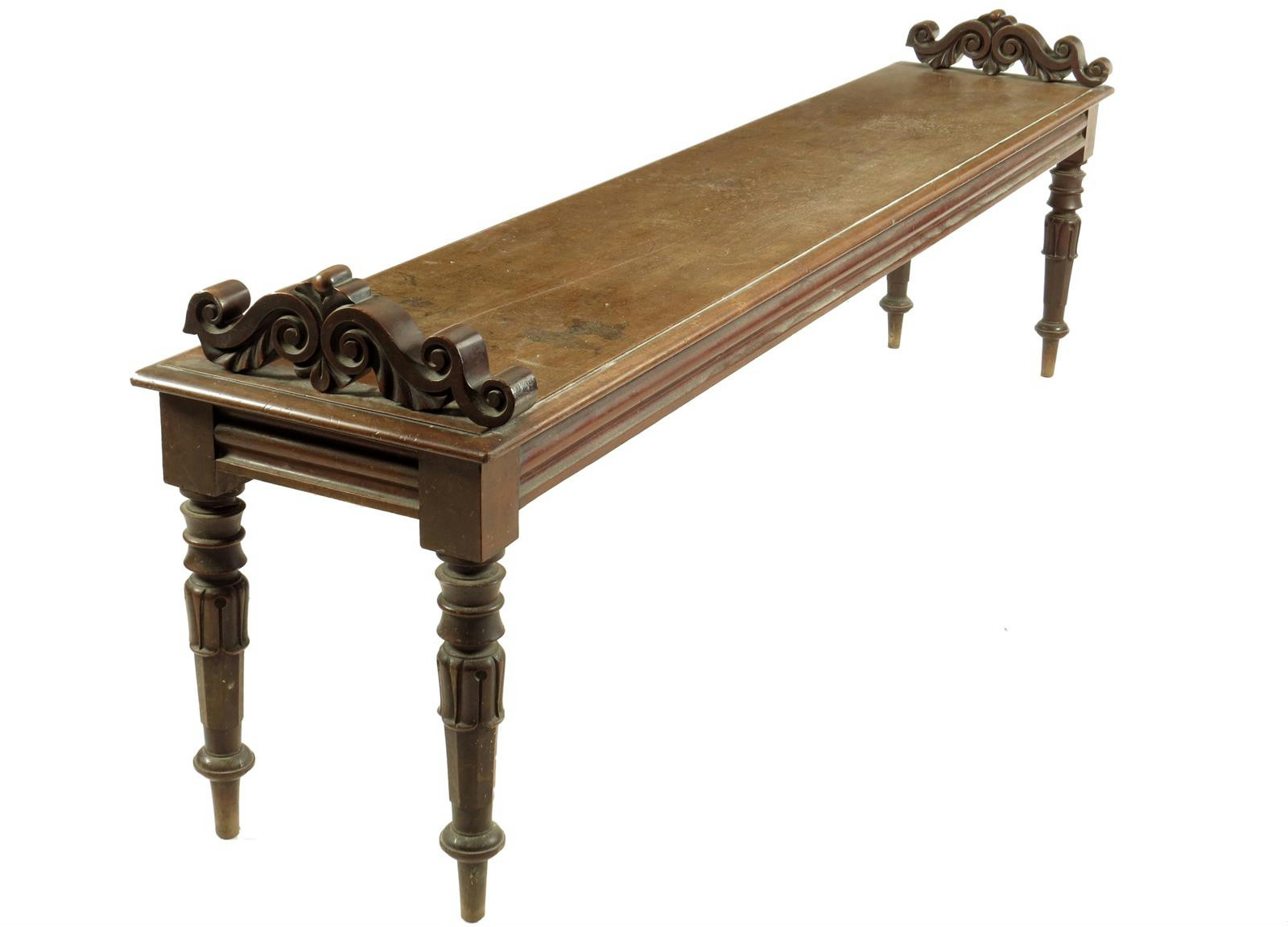 A William IV mahogany hall bench, with leaf and scroll carved bolster ends on turned lappet carved and faceted tapering legs, 57.7cm high, 183cm wide, 37cm deep.