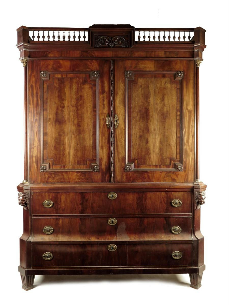 An early 19th century Dutch mahogany linen press, the detachable turned spindle cornice centred a leaf carved panel above pair of panelled doors flanked by gilt brass Corinthian pilasters, enclosing shelves above three long drawers flanked by draped lion's head masks, 235cm high, 169cm wide, 57.7cm deep.