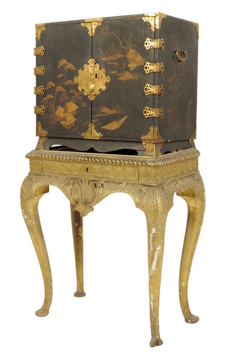 A Japanese black lacquer cabinet, with engraved gilt metal mounts and hinges the doors decorated a watery landscape enclosing five long drawers, the sides with carrying handles, on an associated George II giltwood stand, the Greek key frieze fitted a drawer to a shell and leaf carved apron on cabriole legs and carved pad feet, 119.8cm high, 65.8cm wide, 37cm deep.