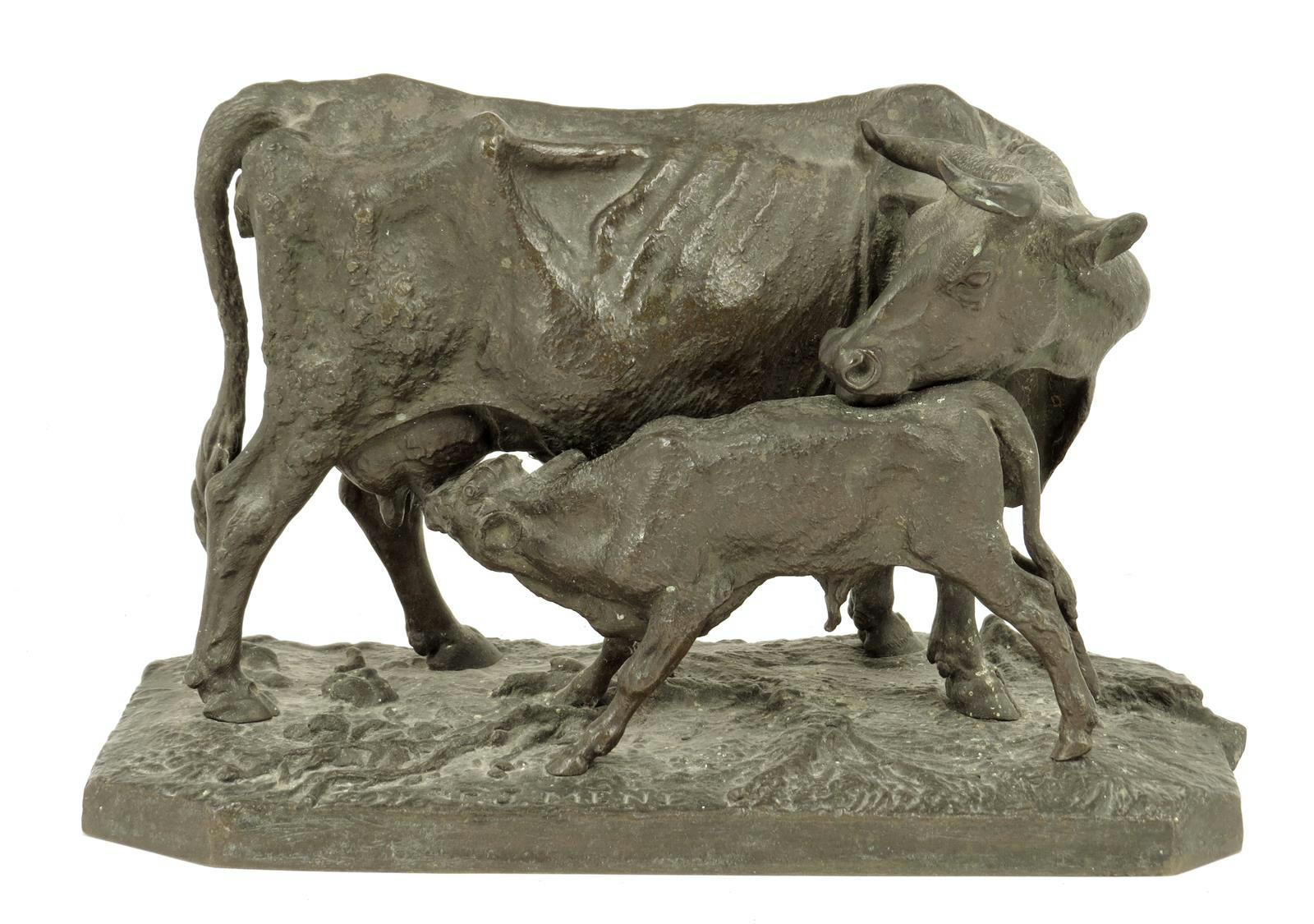 Pierre Jules MĂȘne (French, 1810-1879). A cow and calf, bronze, on a naturalistic base, signed 'P. J. MENE', 14.3cm high, 23.2cm wide, 11cm deep.