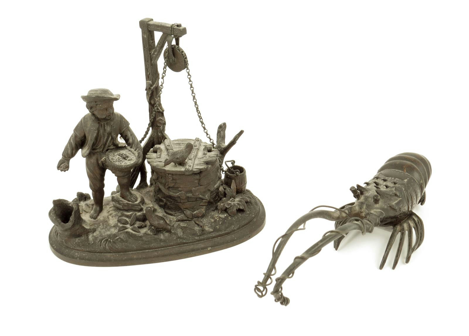 A 19th century bronze langoustine, 19cm long and a 19th century bronze inkwell, modelled with a young boy beside a well, 13.7cm high. (2)