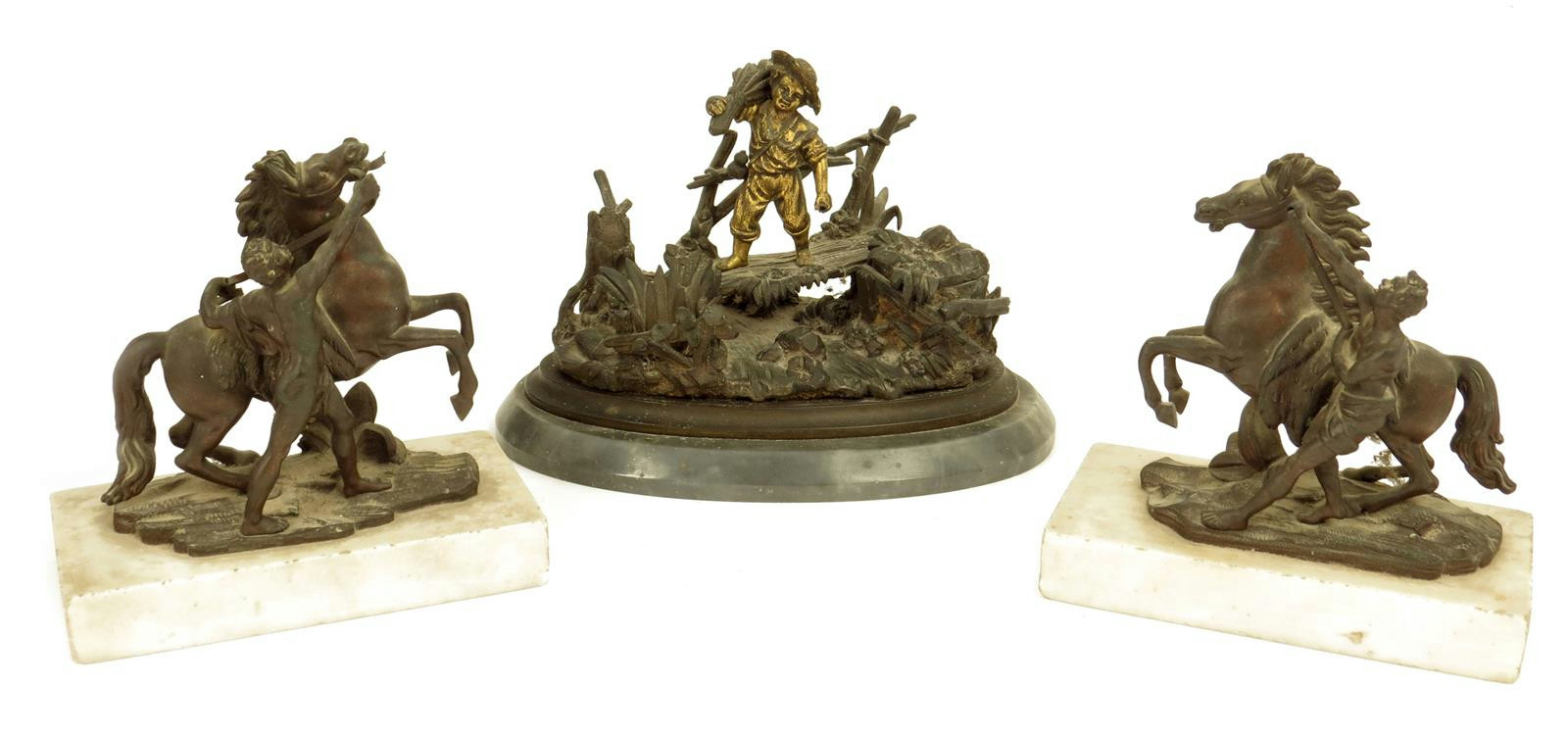 A pair of 19th century bronze Marly horse groups, on marble bases, 13.8cm high, 14cm wide, together with a 19th century gilt and patinated bronze inkwell, naturalistically modelled with a young boy holding a sheaf of wheat, on a marble base. (3)