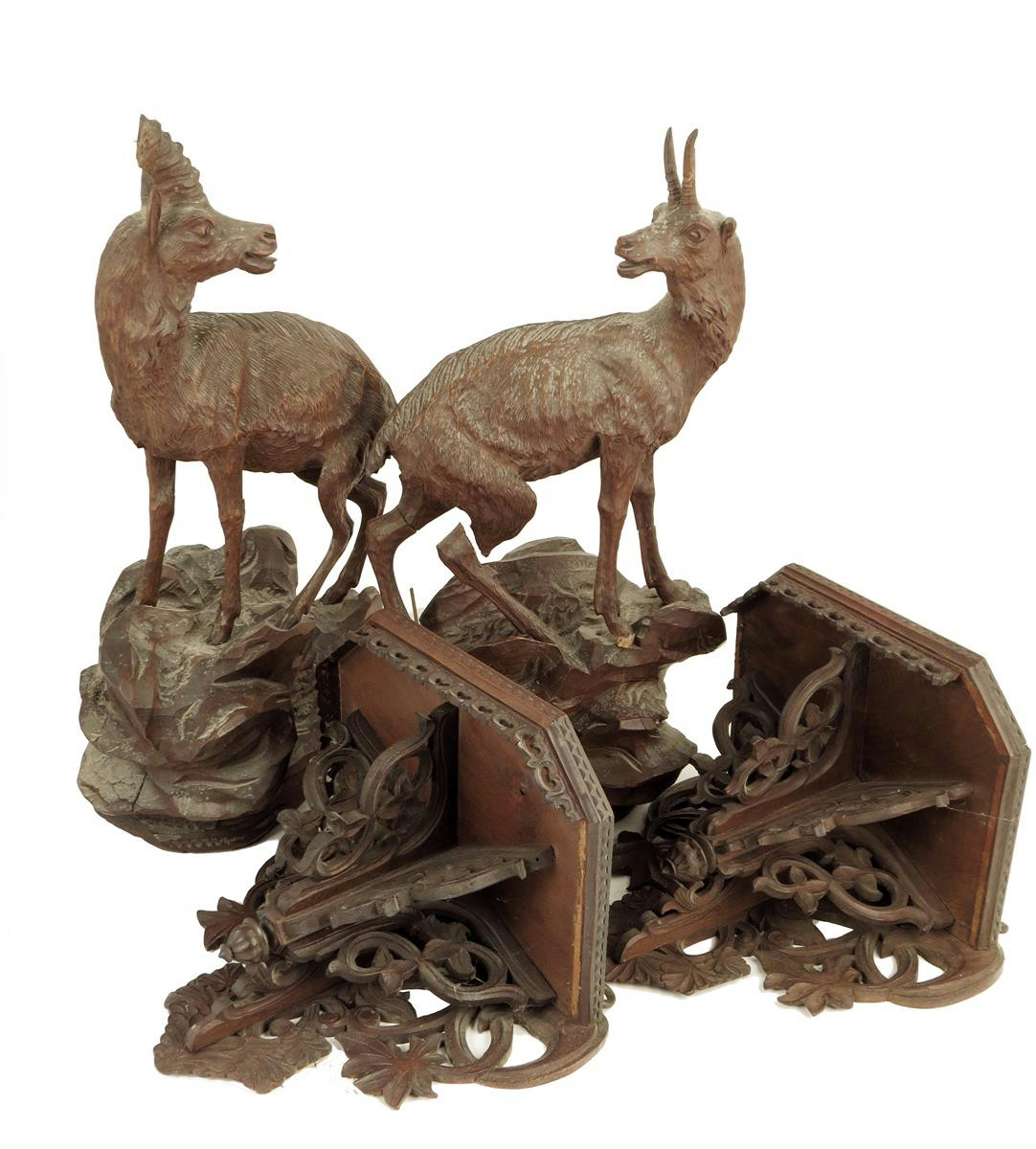 A pair of late 19th century Black Forest carved wood ibex, each standing on a rocky base, 44cm high, 24.5cm wide with scrolling leaf brackets. (4)