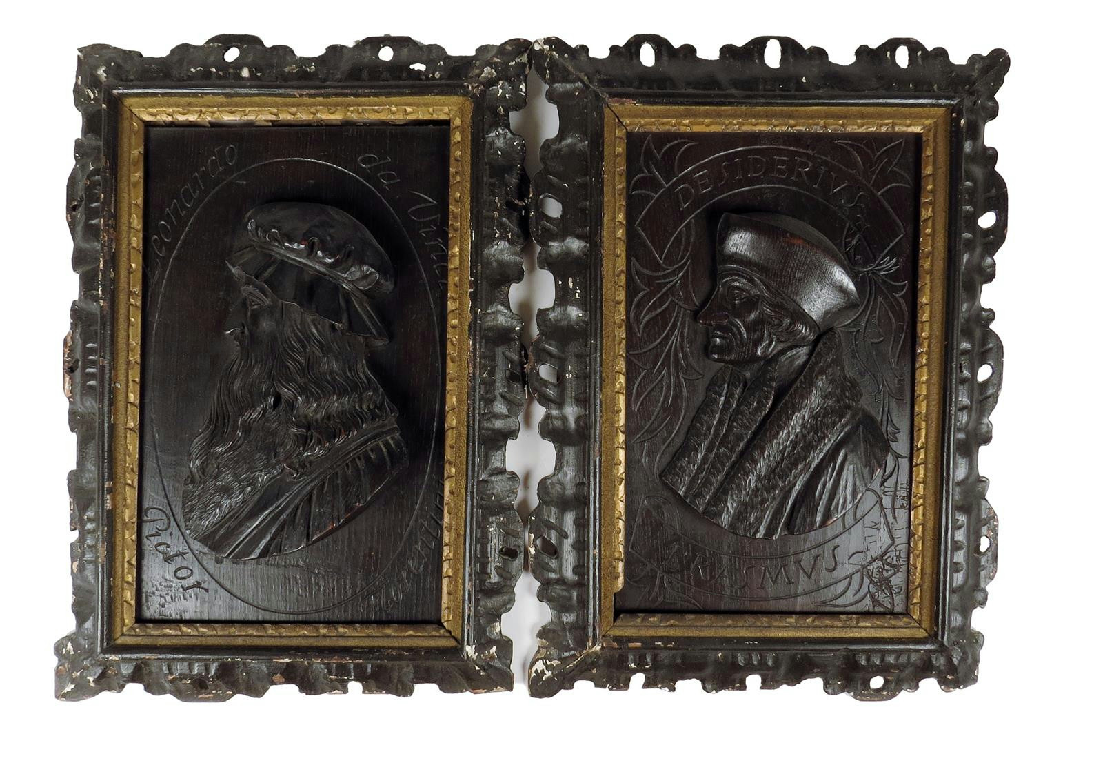 Eight continental relief carved oak plaques, of Christ, Leonardo da Vinci, Erasmus, The Virgin Mary, Johannes Calvinus and 'S. IOHANNES', each in a carved wood and parcel gilt frame, 17th century and later, 55 x 38.5cm. (8)