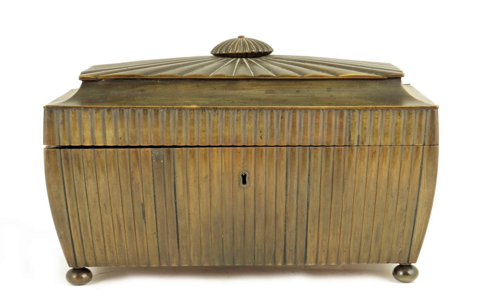A 19th century Anglo-Indian horn tea chest, of ribbed sarcophagus form, the sandalwood lined interior to a pair of lift-out canisters with hinged lids, flanking an associated cut glass sugar bowl on bun feet, 20cm high, 33cm wide, 17.3cm deep.