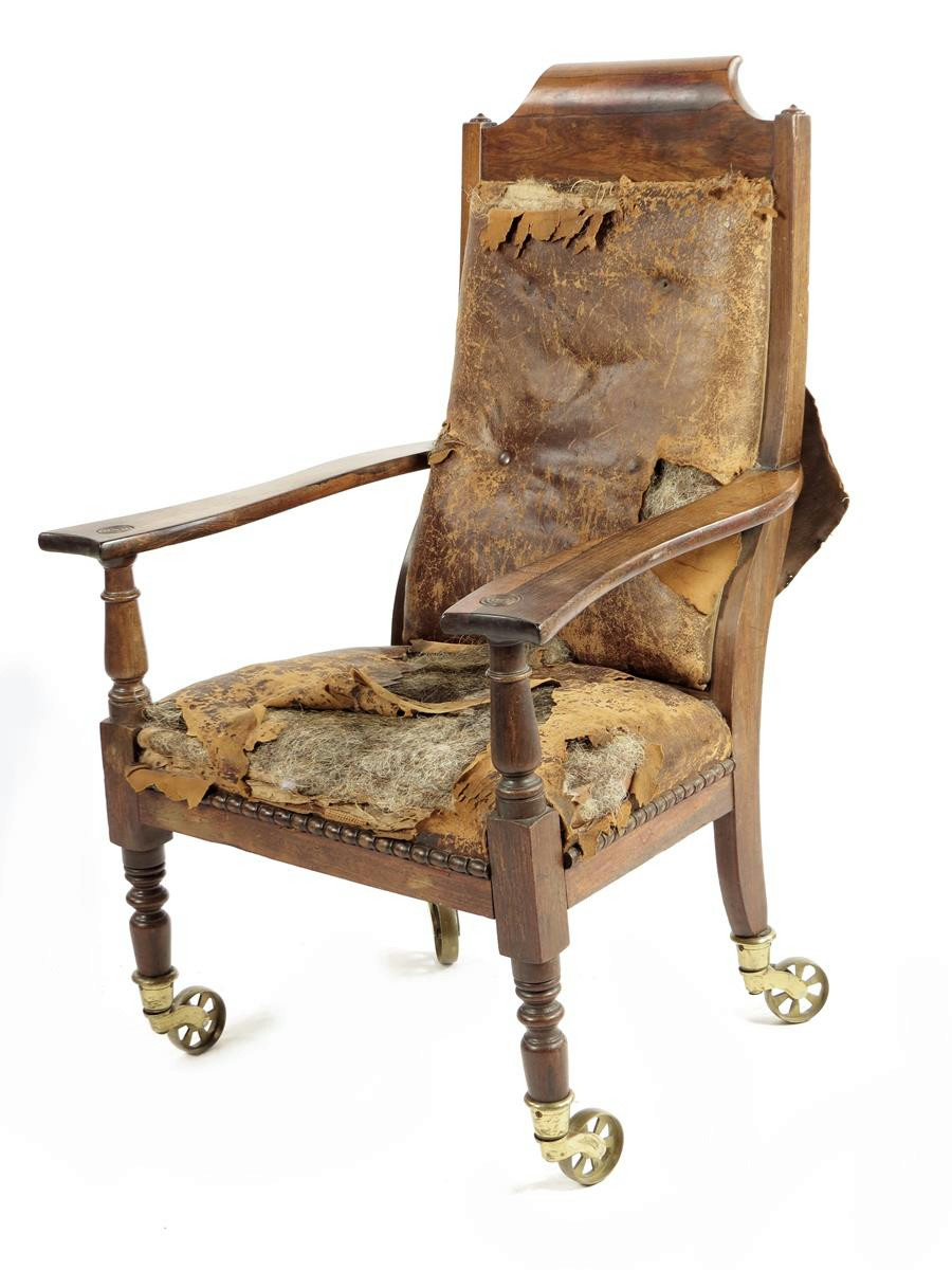 λ A William IV rosewood open armchair, with a distressed leather back and seat on turned front legs and associated brass caps and spoke castors.
