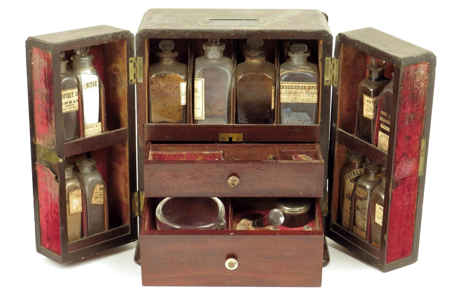 An early 19th century mahogany apothecary's box, with a sunken brass handle above a twin hinged front revealing a fitted interior with divisions for sixteen bottles, thirteen present, with various labels for 'COMMANS & WILSON, 11 GEORGE STREET, BATH', 'EDGAR NEALE, High Street Chippenham' and 'GODFREY & COOKE, SOUTHAMPTON STREET COVENT GARDEN, LONDON', with two drawers with brass scales, leather boxed grain weights, a pestle and mortar and further bottles, the back with a sliding cover revealing four bottles and stoppers, 26.3cm high, 22.3cm wide, 17.8cm deep.