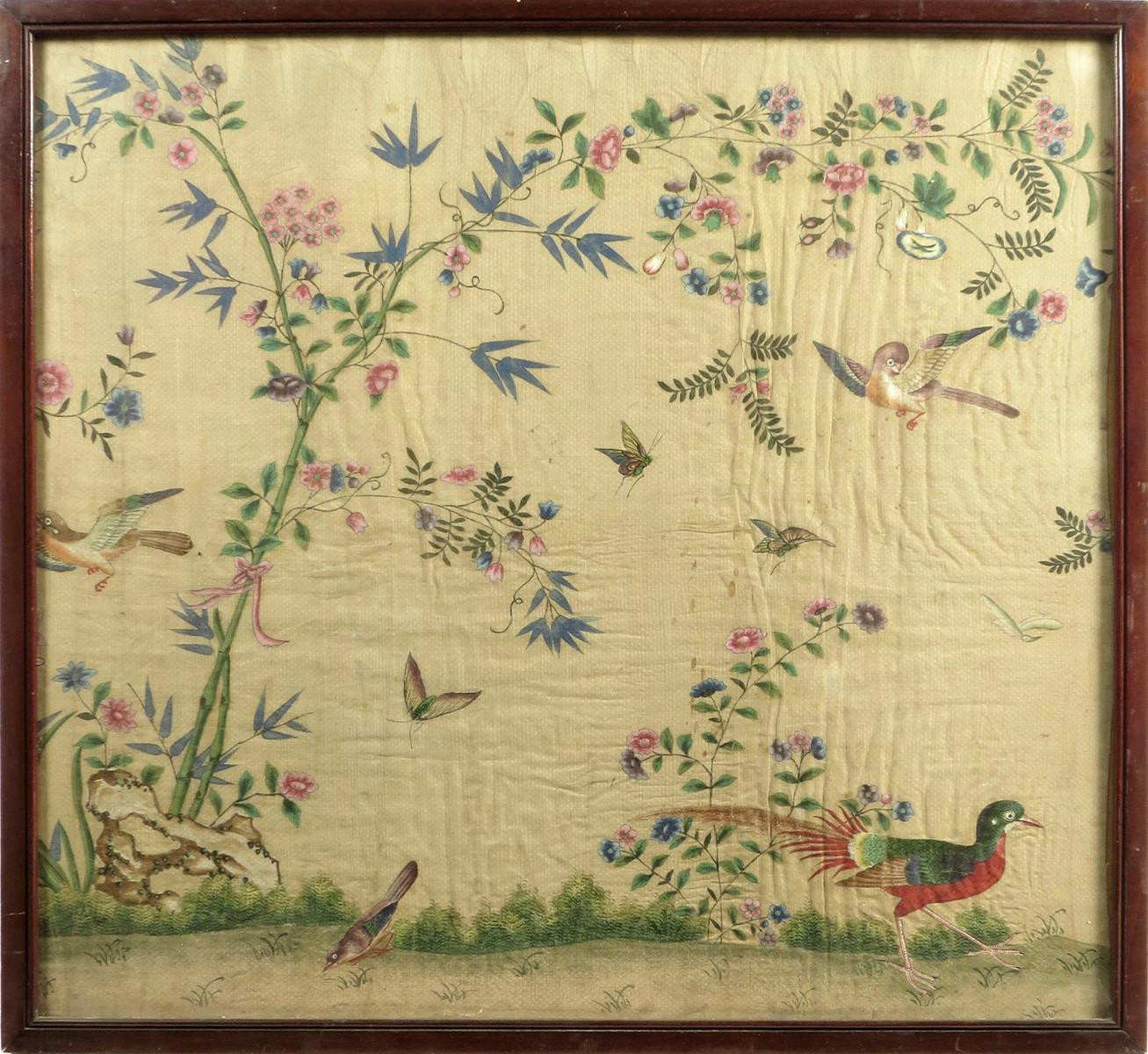 A 19th century Chinese painted textile panel, decorated with exotic birds and butterflies amidst flowers and foliage, in a mahogany glazed frame, 75.7 x 82.5cm.