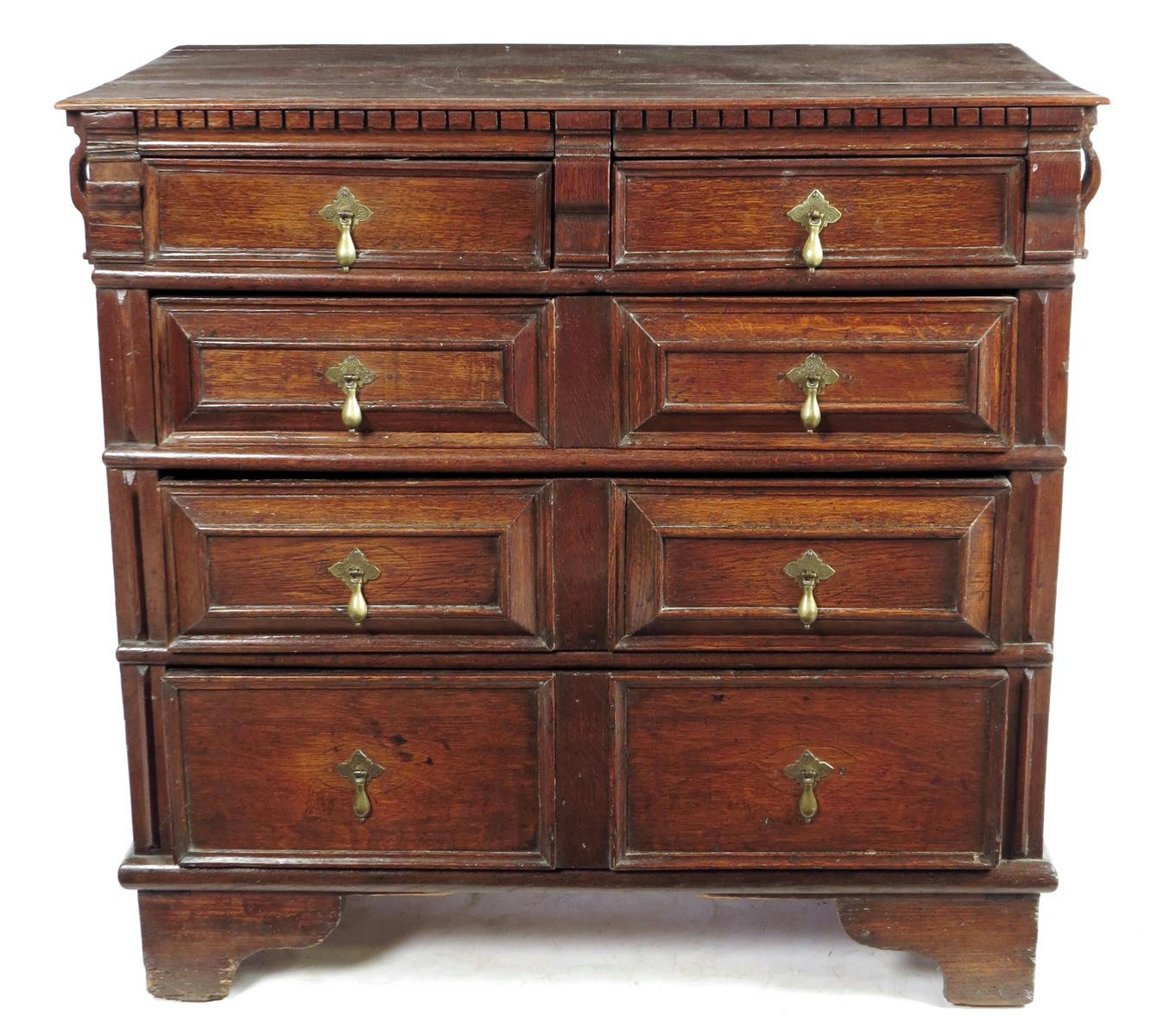 A late 17th century oak chest, with two short and three long panelled drawers, fitted with later brass drop handles, on bracket feet, 95cm high, 97.3cm wide, 56.7cm deep.