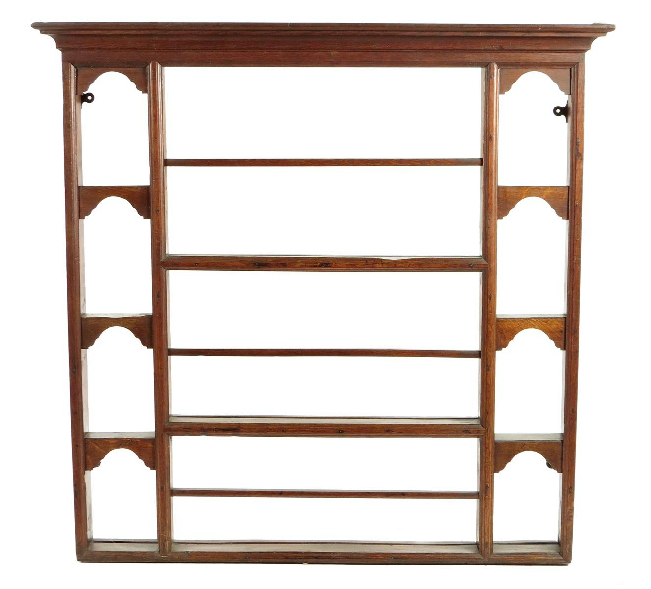 An oak and pine plate rack, with three central shelves flanked by four arched alcoves to either side, late 18th / early 19th century, 120.1cm high, 122.7cm wide, 15.8cm deep.