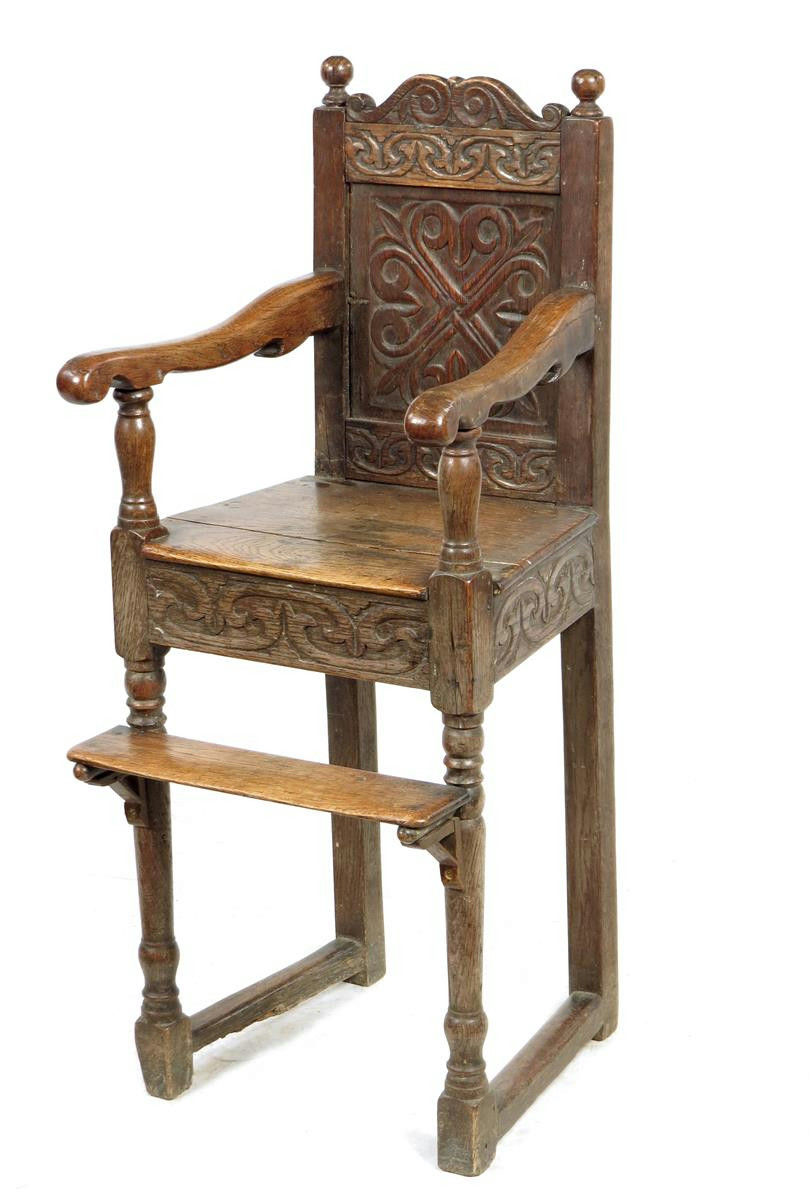 A joined oak child's high chair, with a carved panel back.