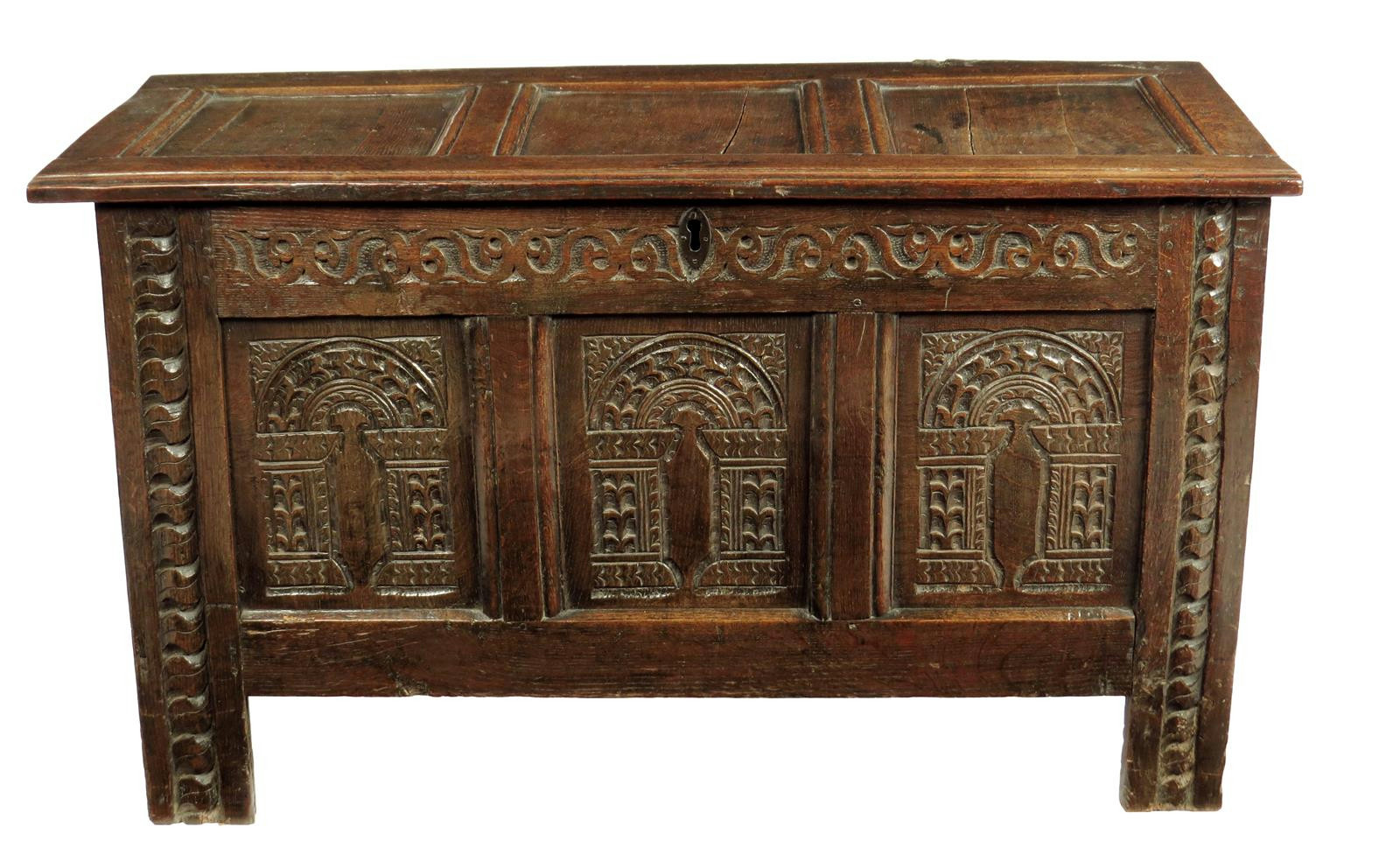 A late 17th century joined oak triple panelled chest, the hinged top above a scrolling foliage frieze and leaf carved arches, West Country possibly Salisbury, 67.7cm high, 117.6cm wide, 52cm deep.