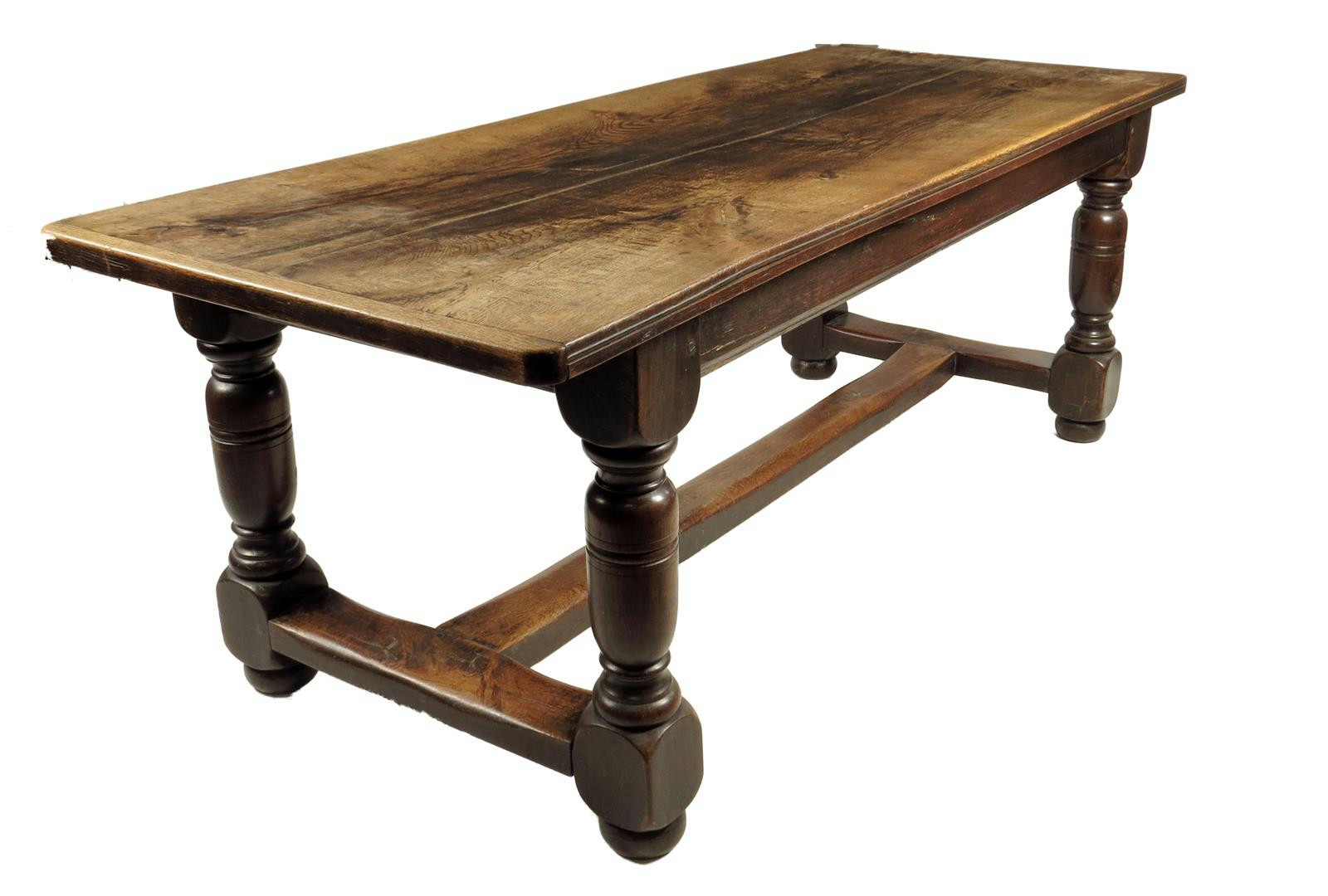 An oak refectory table in 17th century style, with a detachable planked top with cleated ends on stretchered turned supports, 76.7cm high, 211.5cm wide, 84cm deep.
