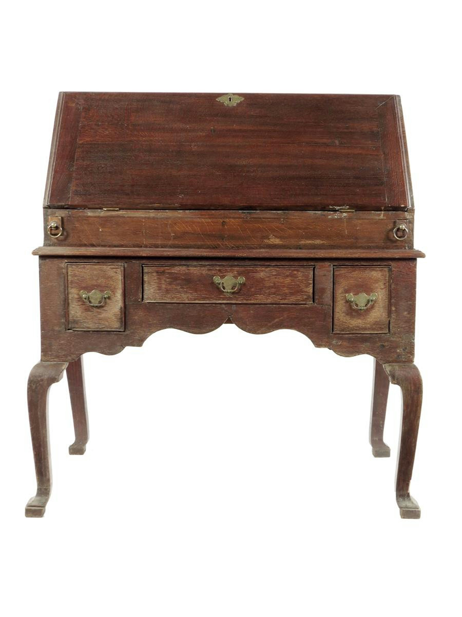 An oak bureau on stand, the fitted interior with pigeon holes, drawers and a well with a sliding cover, the stand with three drawers on square section cabriole legs, mid 18th century and later, 108cm high, 99.4cm wide, 55.4cm deep.