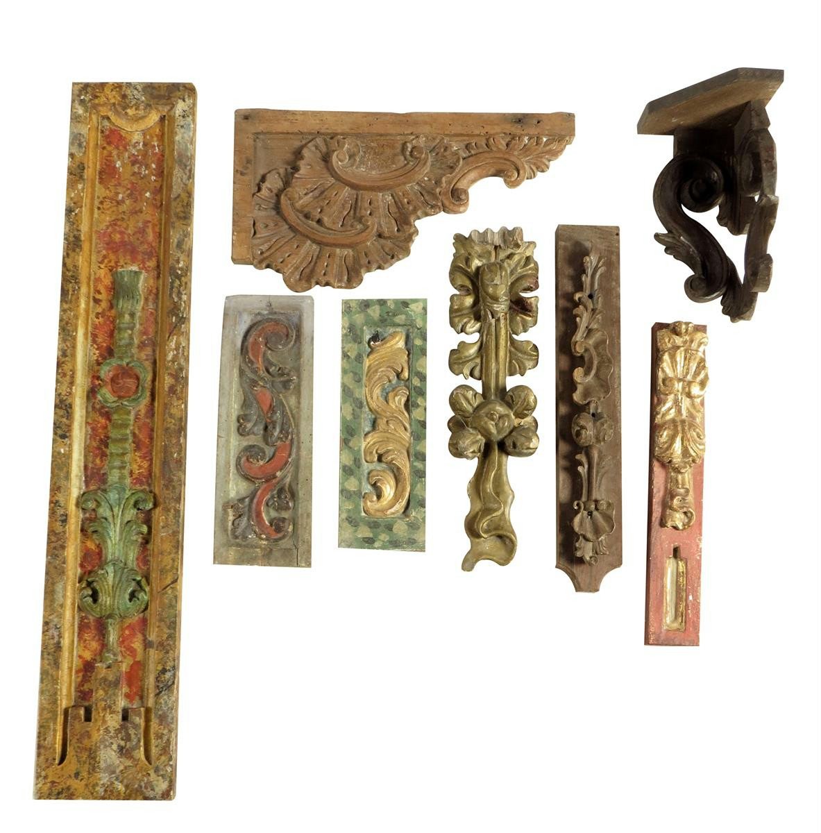 A small collection of Spanish plaques and carvings, including: polychrome decorated panels, a chestnut corner bracket and a giltwood corbel, 17th / 18th century, 98.5cm high, max. (8)
