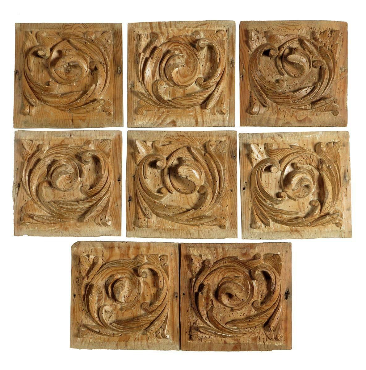 A set of eight Spanish carved pine panels, decorated with leaf scrolls, 17th / 18th century, 22 x 22.3cm. (8)