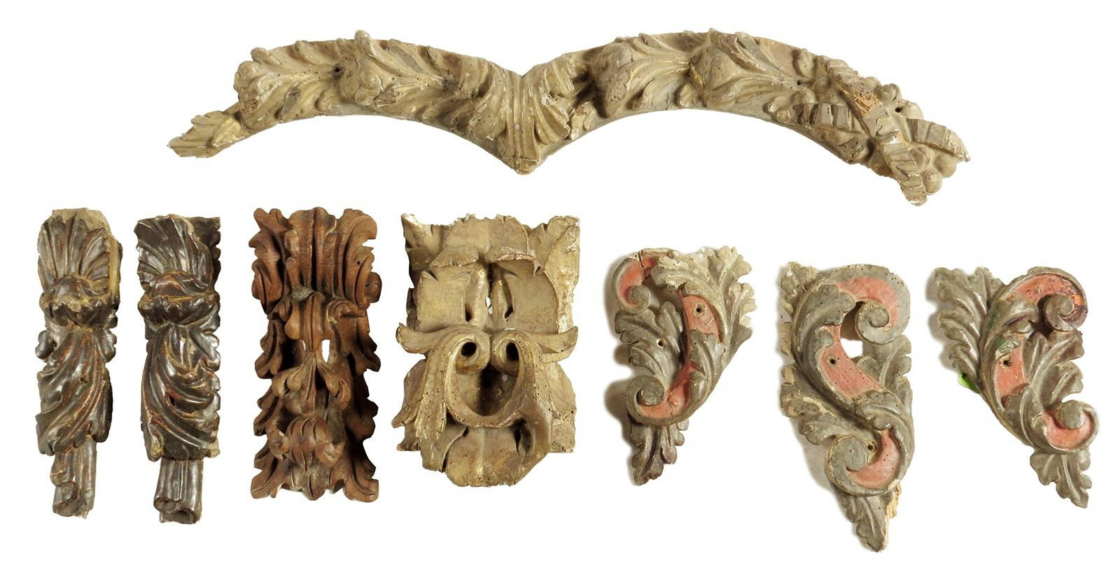 A small collection of Spanish carvings, including: giltwood corbels, polychrome decorated leaves, 17th / 18th century, 78cm wide, max. (8)