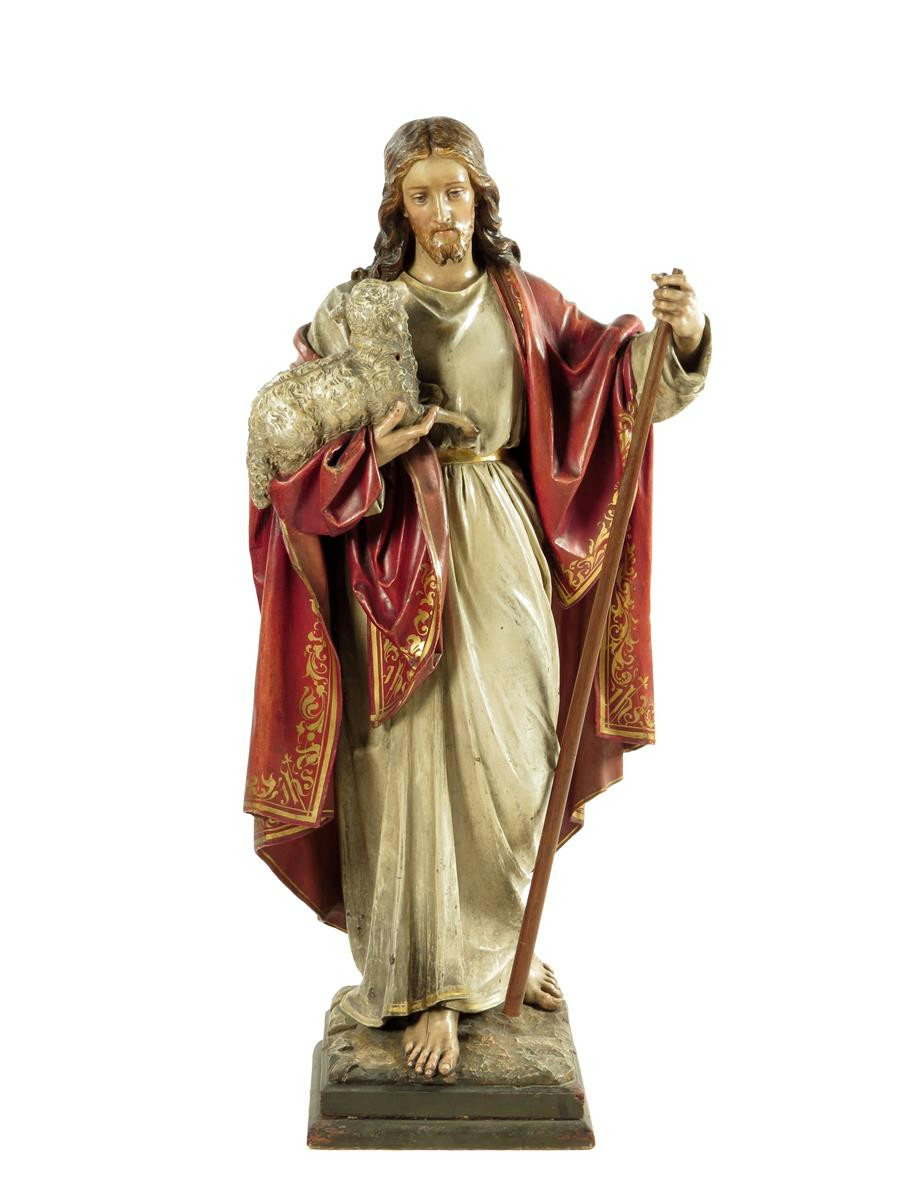 A 19th century continental carved and painted pine model of Christ the Shepherd