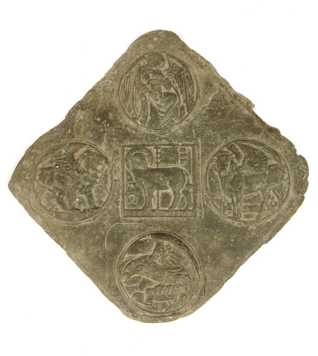 An 18th century lead plaque, relief decorated the symbols of the four evangelists, the centre with the Agnus Dei, 21.3cm square.