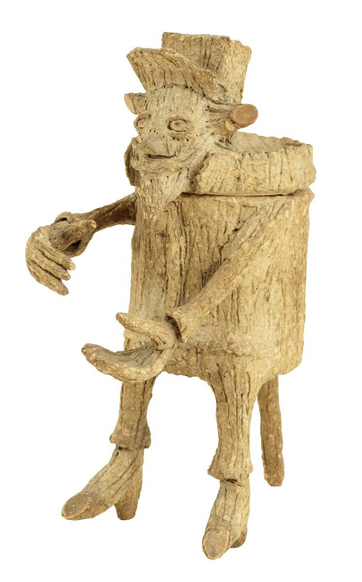 A 19th century French papier-mâché figural tobacco jar, with a bark effect finish, with a ceramic liner, 25cm high, 10cm wide.