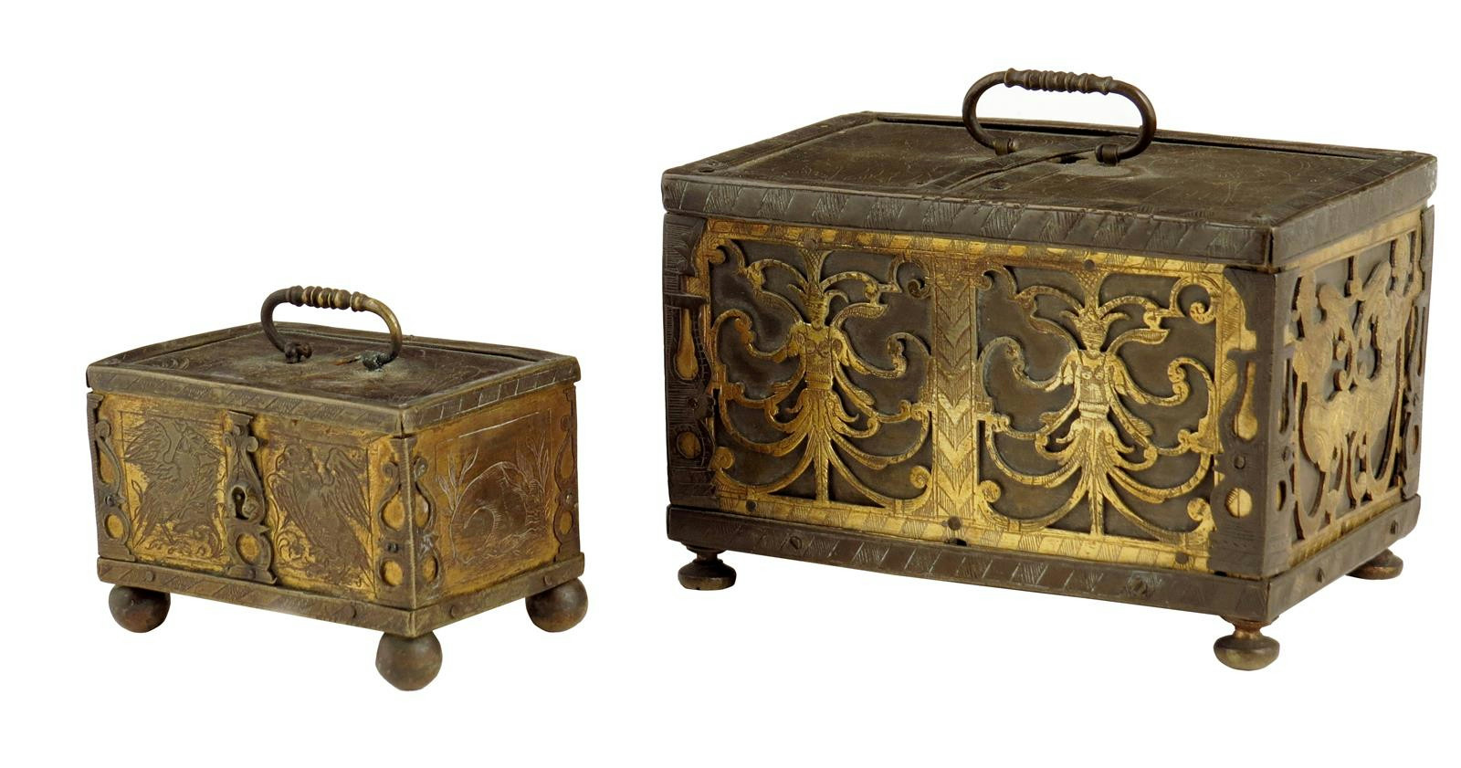 Two 16th century style South German gilt and patinated brass caskets, each with a swing handle, with engraved decoration one of figures and and caryatids, the other with birds and animals, on ball feet, 8.1cm high, 12cm wide, max. (2)
