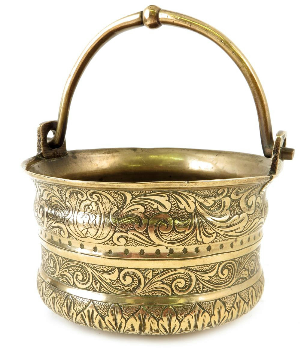 An Italian bronze laver, with a swing handle, the body engraved with scrolling foliage and with two cartouches, one with a portrait bust the other with a coat of arms, the base with the lion of St. Mark the Evangelist, Venice 17th / 18th century, 10.3cm high, 15.3cm wide.