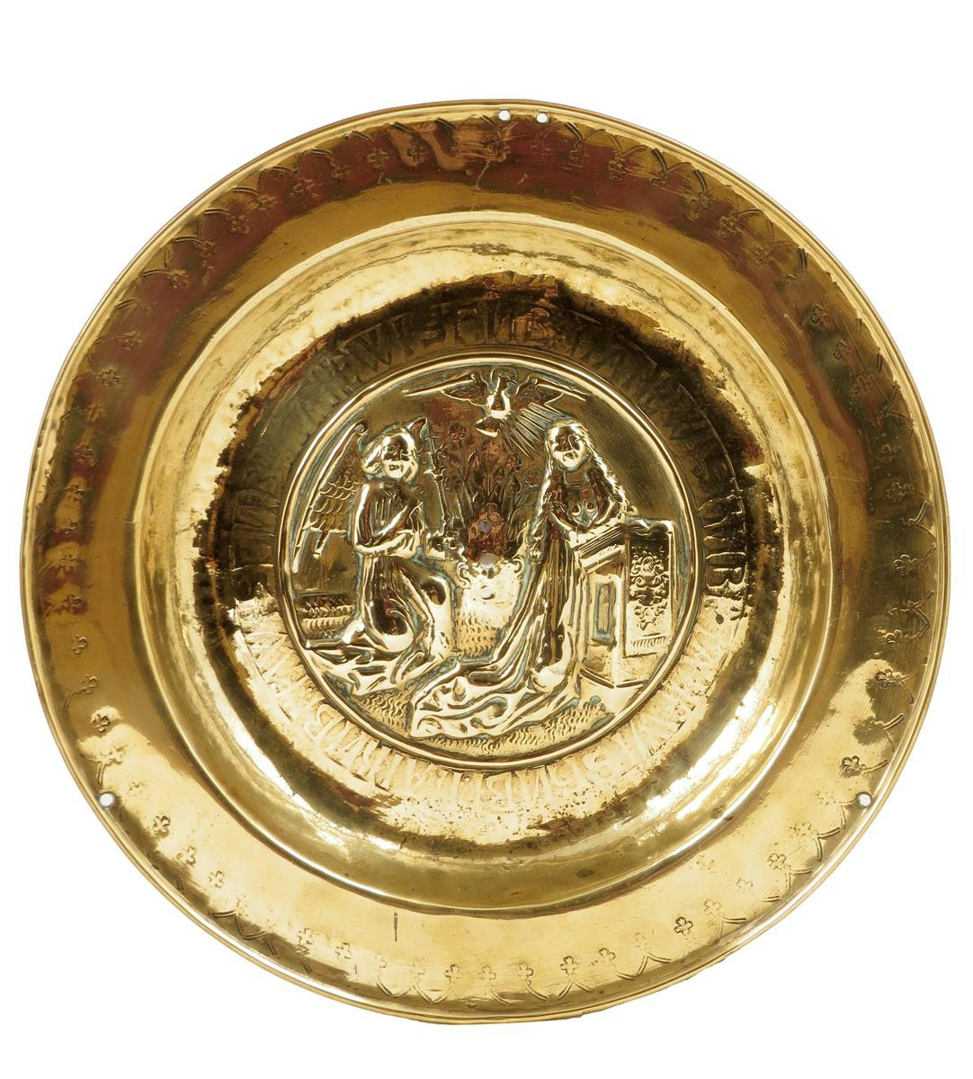 A 16th century German brass alms dish, the centre decorated with the Annunciation of the Virgin, within a band of script, Nuremburg, 37cm diameter.