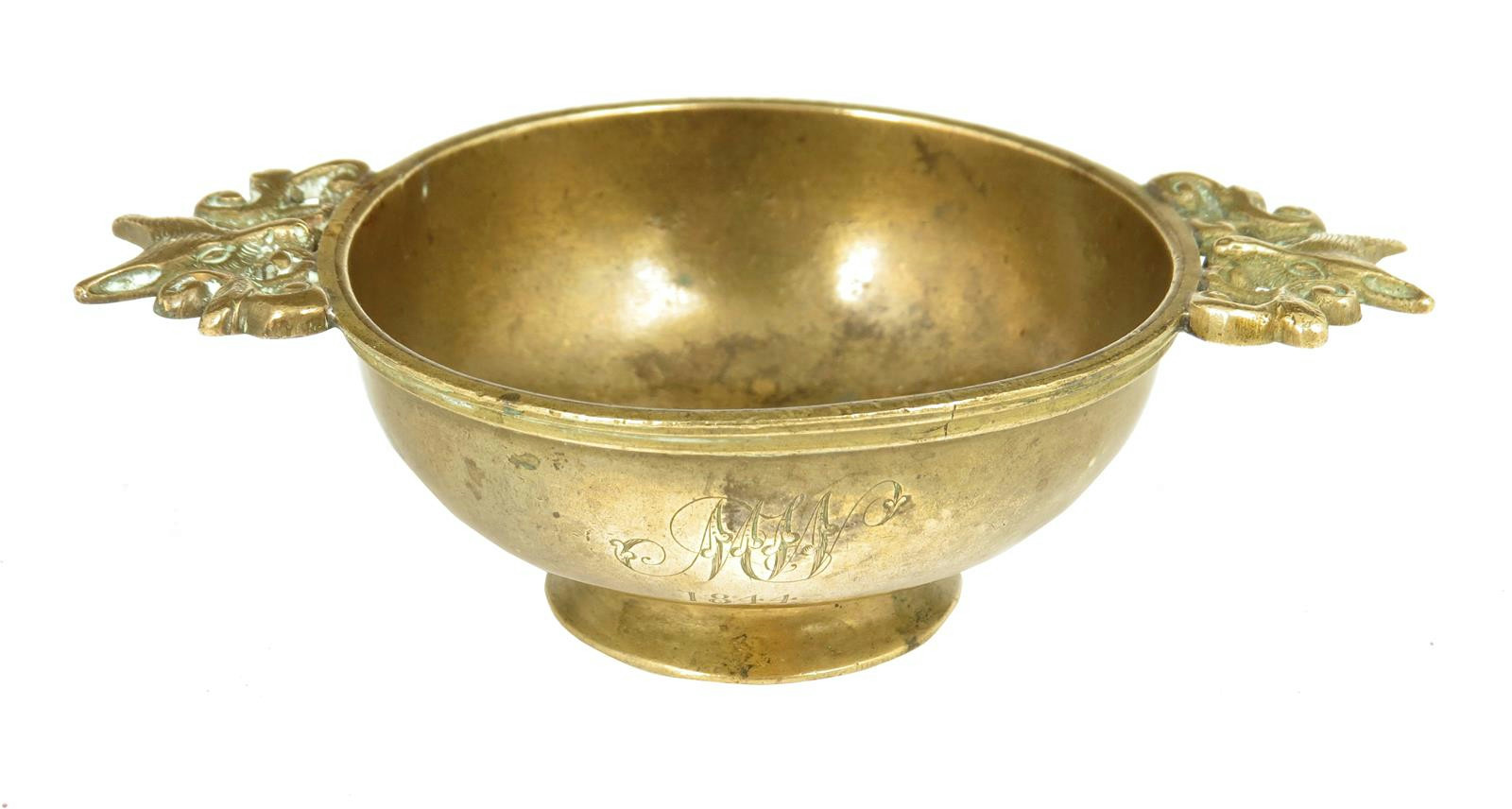 A Victorian Scottish brass quaich, with fox's head handles, the body with initials 'MW' and dated '1844', 2.6cm wide, 10.5cm wide.
