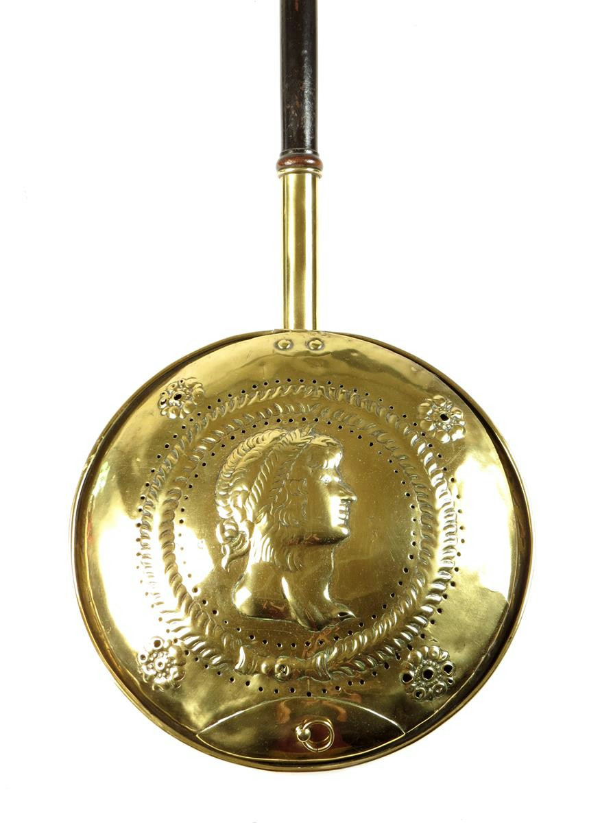 An early 19th century brass warming pan, with an ebonised turned handle to a pierced lid repoussé decorated a bust of George IV, inscribed 'G R crowned', 144.7cm long.